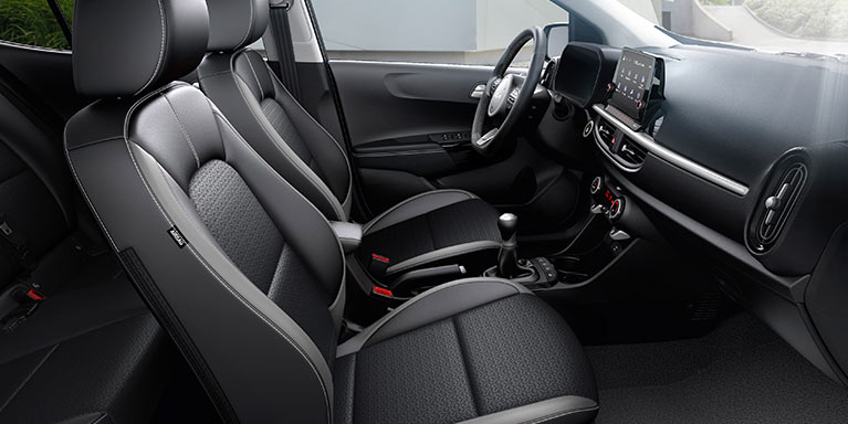 Der Vibe im Innenraum? Ganz wie du willst. Ausstattungsabhängig erhältst du deinen Picanto zum Beispiel mit Stoffsitzen in Schwarz, mit Sitzen in hochwertiger Ledernachbildung und Interieurelementen in Hochglanzschwarz. Für noch mehr Komfort sorgt die Sitz- und Lenkradheizung.